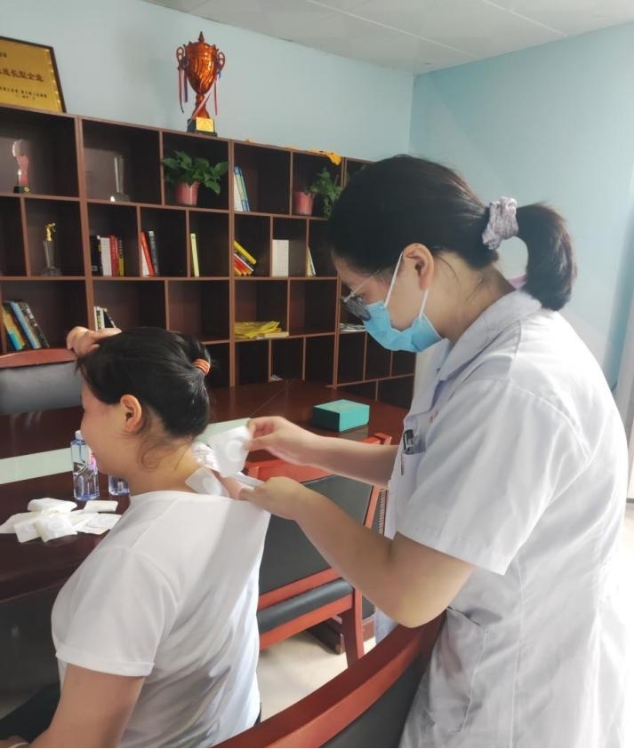 下属平阳公司为员工策划了贴敷三伏贴健康活动,为奋战在一线的员工献上独特“健康礼”。活动现场,中医师们通过深入浅出地讲解,向员工普及“冬病夏治”的中医理念以及三伏贴的适应症与保健价值,并根据个体体质精准施贴,确保效果最大化。