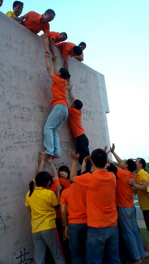 在专业拓展教练的组织和带领下,所有人员分成红黄两队进行训练,在一系列轻松、活泼的准备活动之后,两组队员先后分别进行了“天使之手”、“空中独木桥”、“地雷阵”、“蜘蛛网”和“胜利墙”等训练项目。“天使之手”是两位队员在8米高空中相互携手走过钢丝,“空中独木桥”是每位队员独自走过横在8米高空的钢管,“地雷阵”是每组队员通过集体智慧在10*10的地雷阵中找到唯一的求生通道,“蜘蛛网”是每队队员通过集体协作穿过一组大小不等的绳网,“胜利墙”则是全体人员通过组织、配合和协作徒手攀上4.2米高的水泥墙。每项活动后,教练都组织每队人员畅谈活动心得和感受,让大家能够从活动中得到启发和收获。